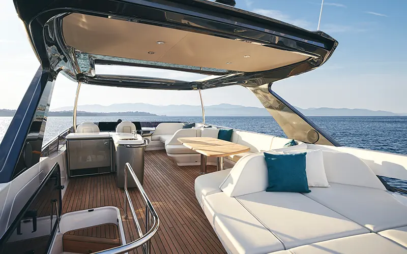 The yacht’s outdoor spaces are impressive, starting with an aft deck that features a large, flexible seating, dining and storage area. Above on the flybridge is wide open space for entertaining and stretching out, including a wet bar, grill, and sun loungers all situated behind the upper helm area. The foredeck provides another great place to sit back and relax, with ergonomic seating areas and twin sun pads.