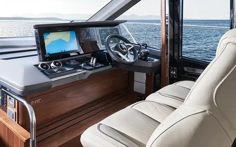 Another standout feature is the glass bridge system, which is a flexible and intuitive way to control all major systems, including engines, generators, lighting, and air conditioning. These digital controls are customizable, allowing the owner to personalize the interface to their preferences.
