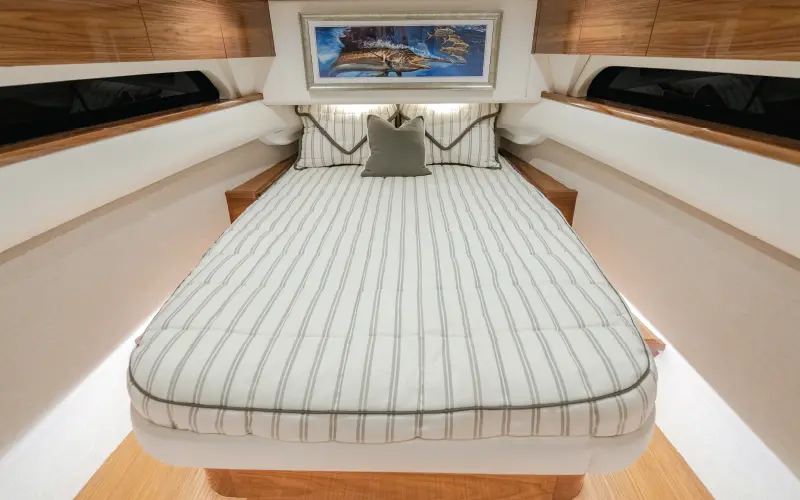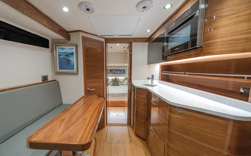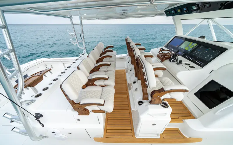 The generous beam provides a platform for many of the great features available on a V-55, including nine Release Marine teak helm chairs in two rows. Wide passageways along the gunnel from the cockpit to the forward seating and bow area offer unhindered movement while fighting a fish. The generous cabin, easily accessed from the starboard side of the helm station, includes a private stateroom, head, galley, dinette and additional sleeping quarters.