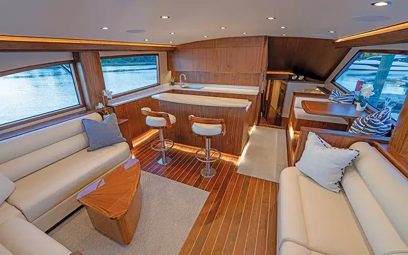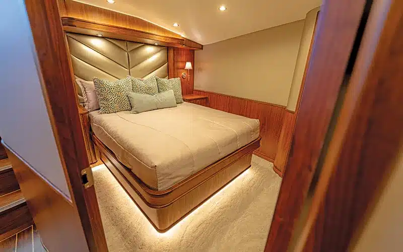 Entering the expansive salon, guests’ eyes will be drawn to the salient galley island forward to port, adjacent to a dinette teeming with concealed storage. Another unconventional touch in this newest Jarrett Bay is the addition of a settee opposite the traditional L-shaped settee to port. Seating is plentiful between these two plush spaces, especially when including the island barstools and dinette. A flatscreen TV rises out of concealed cabinetry from behind the additional settee and is complemented by a high-tech entertainment system. The beautiful walnut veneer and solid wood finishes throughout the salon continue down forward along with the quartzite countertops. While many 64-foot convertibles aim to offer three or even four staterooms, hull 65 is equipped with two spacious and luxurious staterooms, one with a private head and the forward stateroom with a shared head. This configuration, specified by the owner, affords space for a generous tackle area with rod and reel storage, and a concealed stacking washer and dryer. To aid in the well-appointed appeal is walnut wainscotting throughout the lower level.