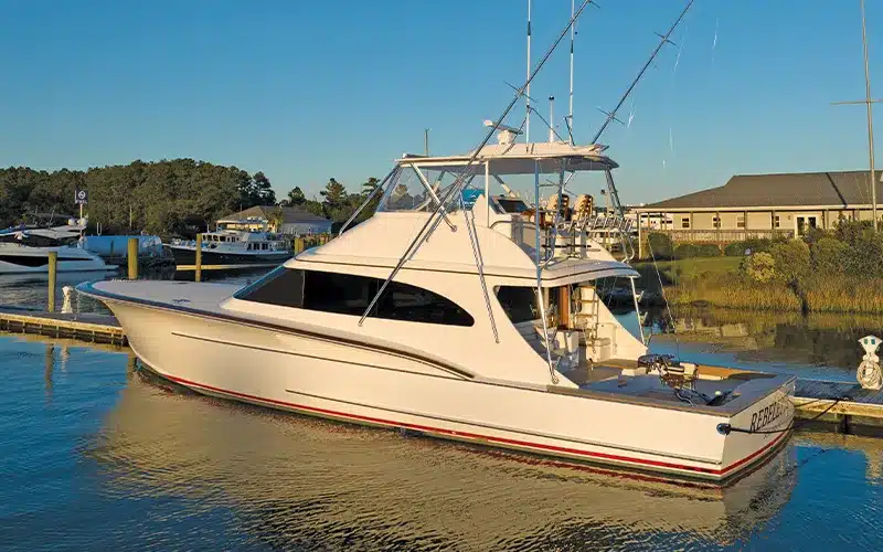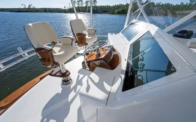Hull 65 is the first new Jarrett Bay to be splashed with Caterpillar Marine’s newest power plant: the C32B. This latest propulsion technology has undergone hundreds of hours of strenuous testing in Jarrett Bay’s hull 48, Iron Leader, serving as the research and demo platform for Cat® power. With twin turbos on each V12 engine, hull 65’s C32Bs are rated at 2,025 hp and are complimented by the Cat® Three60 Precision Control joystick system. Rebelette’s sea trials did not disappoint with smooth rides found at both a cruise of 37kts, as well as wide open speeds pushing 44kts. Additionally, these Cat powerplants were extremely responsive in maneuvering her loaded weight of approximately 98,000 lbs as nimbly as vessels a fraction of her weight. Rebelette’s engine room is finished out with top-of-the-line systems including a Seakeeper 26 gyro stabilizer, Spot Zero watermaker system, ElectroSea descaling system, AXI fuel polishing and management, and a pair of Cat 2.2T generators rated at 27kW each. Hull 65’s systems are laid out for ease of maintenance for the captain and crew and the bright white finish and LED lighting ensures superior illumination.