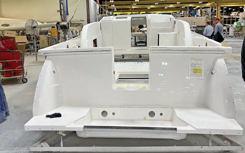 As the team continued through the building, they witnessed the evolution of the 45 and the 43 from bare hulls to fully completed yachts on the production line. First, the hulls are moved to the line and are outfitted with the engines, mechanical components, and electrical wiring. Then the lower interior accommodations are built before being topped with the deck and house. One unique technique of both brands is that the transoms are actually part of the deck mold, which allows the transom gate to be a solid piece instead of a patched junction between the deck and hull as seen in other production builders.